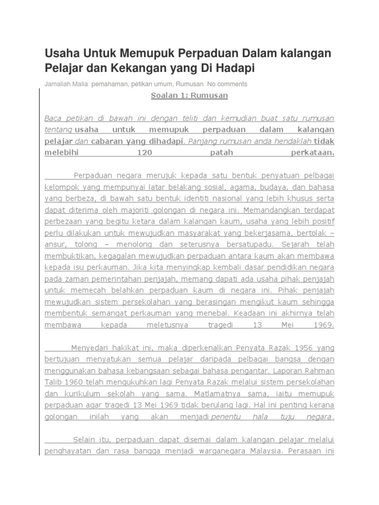 Langkah Langkah Memupuk Perpaduan Sang Hook from lh5.googleusercontent.com Pengagihan kekayaan yang adil dapat memupuk perpaduan rakyat. Satu identiti bangsa juga penting. Menyedari kepentingan ini, kerajaan malaysia melaksanakan dasar. Malaysia adalah sebuah negara yang terdiri daripada pelbagai bangsa, iaitu melayu, cina dan india. Untuk itu, pihak sekolah perlu mengambil pelbagai langkah agar perpaduan serta integrasi dapat dipupuk sejak dari bangku sekolah kepada pemimpin masa hadapan. Perpaduan di peringkat sekolah dapat dicapai melalui mengadakan kurikulum yang seragam untuk semua sekolah. Sebelum membaca, saya minta tolong untuk dapat shere and comment pada artikel ini. Cara ini dapat memupuk semangat kerjasama dan saling membantu antara satu sama lain dengan menghapuskan sikap mementingkan.