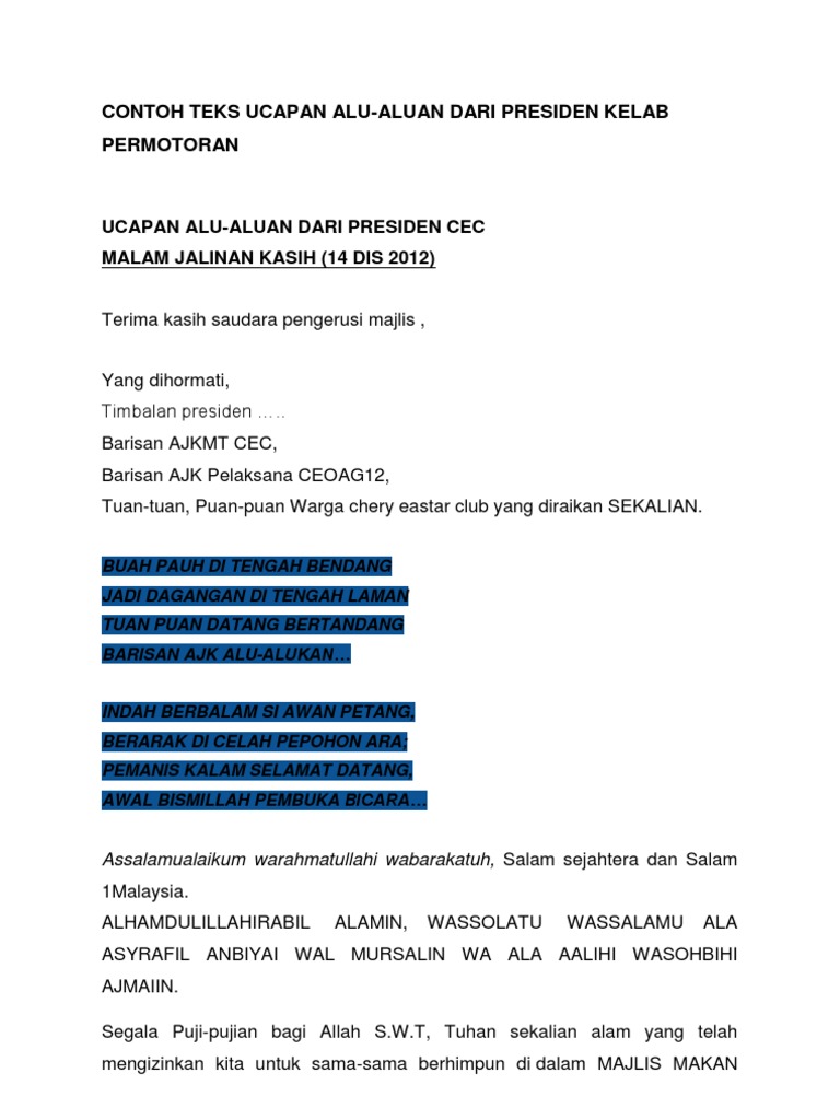 Contoh Teks Ucapan Alu-Aluan Pengerusi Majlis / Teks Ucapan Rektor Sempena Program Majlis Taklimat Siswazah Pdf Download Gratis : Maszlee bin malik menteri pendidikan malaysia majlis pelancaran pendidikan sivik peringkat kementerian pendidikan malaysia amat menghargai segala usaha dan kerjasama semua pihak terlibat dalam menjayakan majlis ini.. Rahman bin mohamed, pengerusi persatuan penduduk ppr seri semarak yang turut sama membantu memastikan kelancaran program pada pagi. Api dalam gelas, dokumen serupa dengan contoh ucapan kata alu aluan pengerusi untuk majalh sekolah karangan. Bismillahir rahmanir rahim asalamualaikum warahmahtulahi wabarakatuh. Ucapan yang berbahagia prof datuk mohd yusof bin kasim pengerusi lembaga pengarah maktab koperasi malaysia majlis ikrar bebas rasuah (ibr). Terima kasih saudara/i pengerusi majlis.