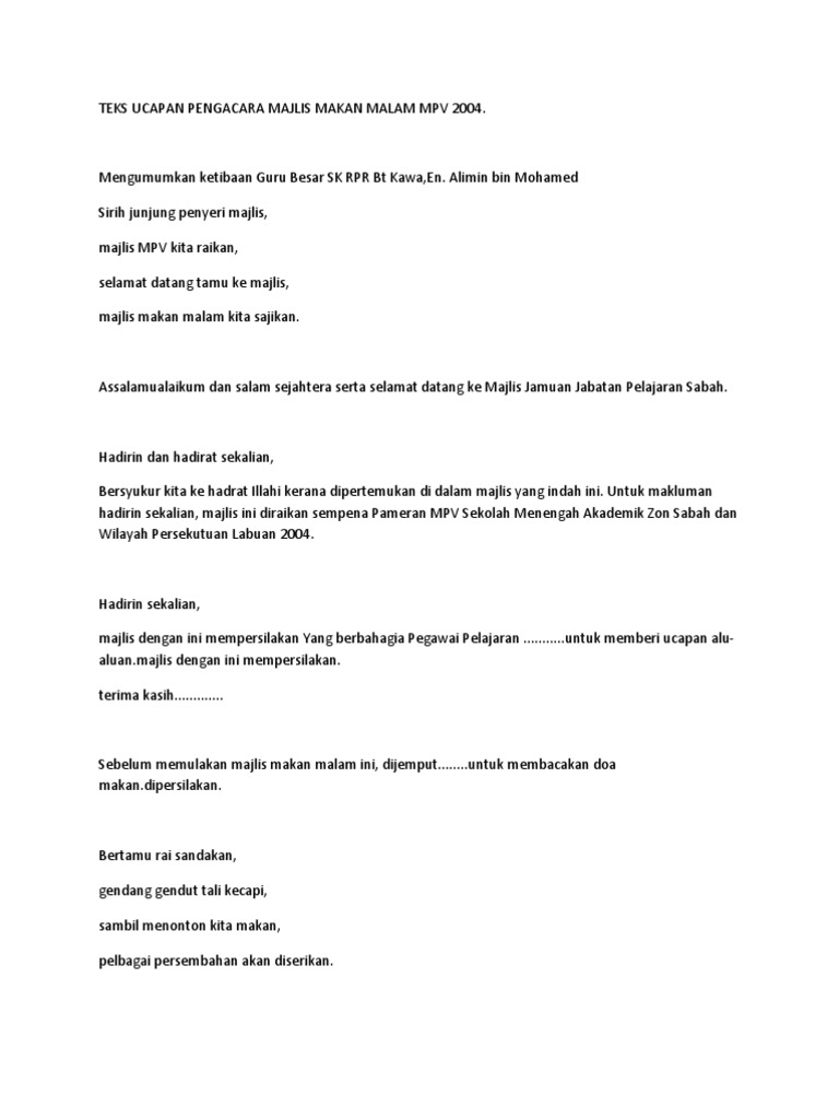 Teks Ucapan Pengacara Majlis Makan Malam Amal Pengakap 2011 from imgv2-1-f.scribdassets.com Teks ucapan pengerusi majlis seminar menjadi muslimah hebat iq, eq dan sq majlis diteruskan lagi dengan nyanyian lagu negaraku beserta alunan bacaan asmaul husna. Masa cue ann 5 11.33 am ucapan alu aluan pengerusi majlis : Majlis suai kenal antara ibu bapa dan jawatankuasa penyelaras tadika perpaduan (jptp) a.k.a pibg jika di sekolah rendah, sambutan hari lahir murid (jan dan feb). Yusnita bt abd rahman selaku pengerusi kelab staf. Pihak majlis mengucapkan terima kasih diatas ucapan yang disampaikan sebentar tadi. Aminuddin bin hassim, pengarah intan sempena majlis perasmian dpa bil. Pagi tadi telah selesai satu program di sekolah tadika anak. Teks ucapan pengacara majlis contoh teks ucapan alu aluan majlis perasmian ucapanku.